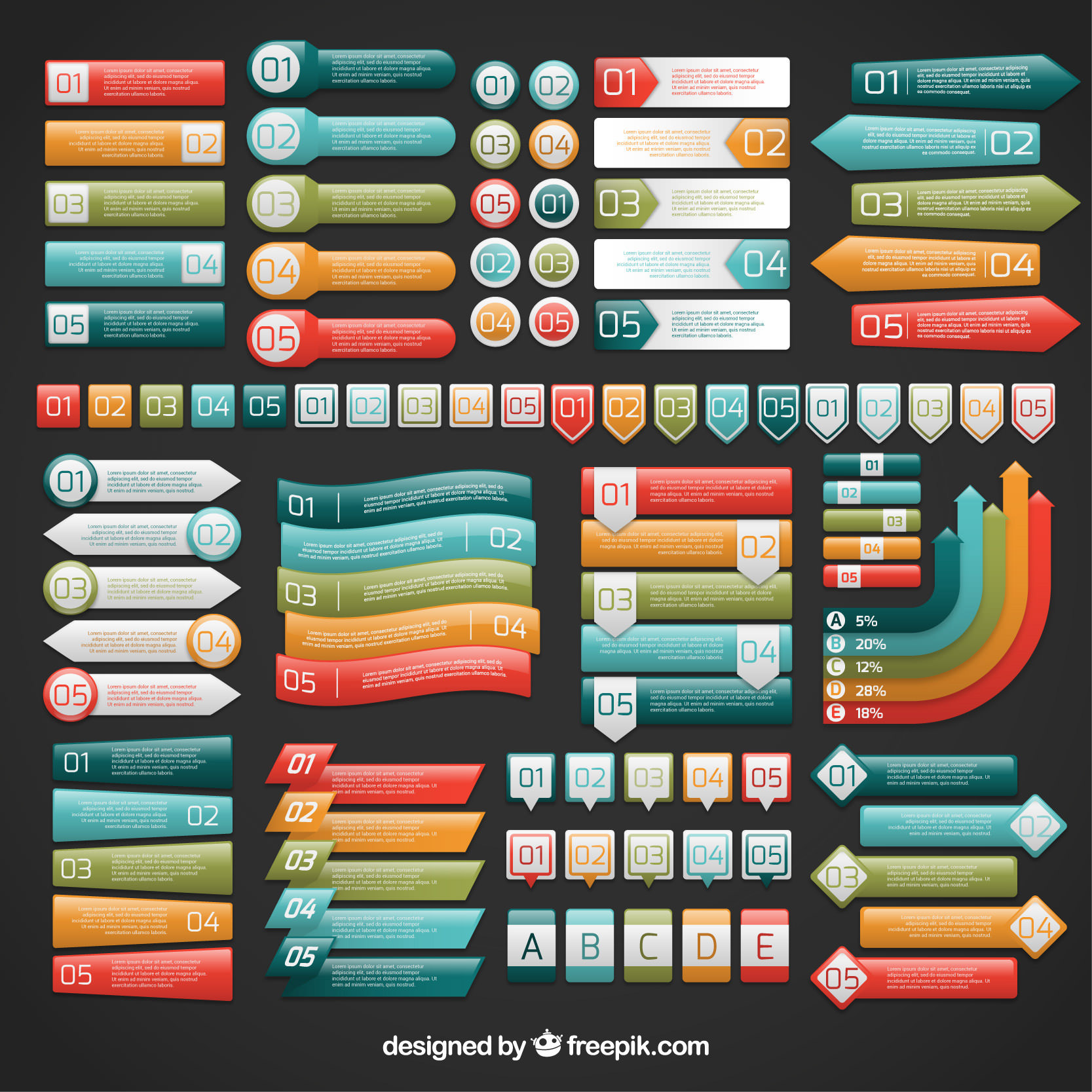 무료 인포그래픽 배너 모음은 5가지 세트로 나뉘어 각 세트는 고유 한 색 구성표와 테마로 구성되었다. 파일은 AI 및 EPS 형식으로 제공된다. 인포그래픽 배너 모음 요소들은 인포그래픽, 그래픽 디자인, PPT 파워포인트, 광고 홍보물 제작에 활용할 수 있다. 무료 다운로드하려면 이메일을 입력하면 된다.