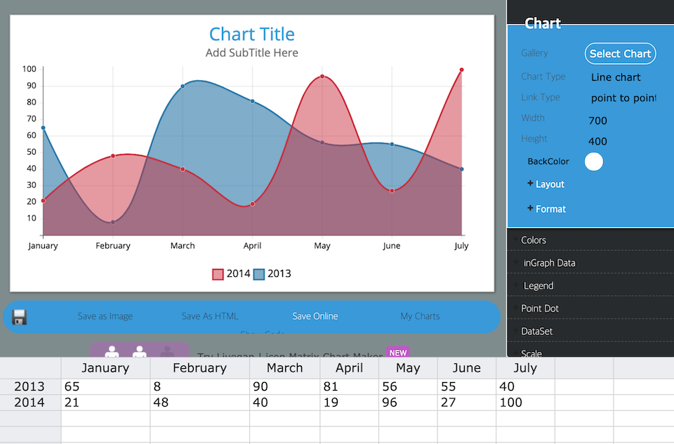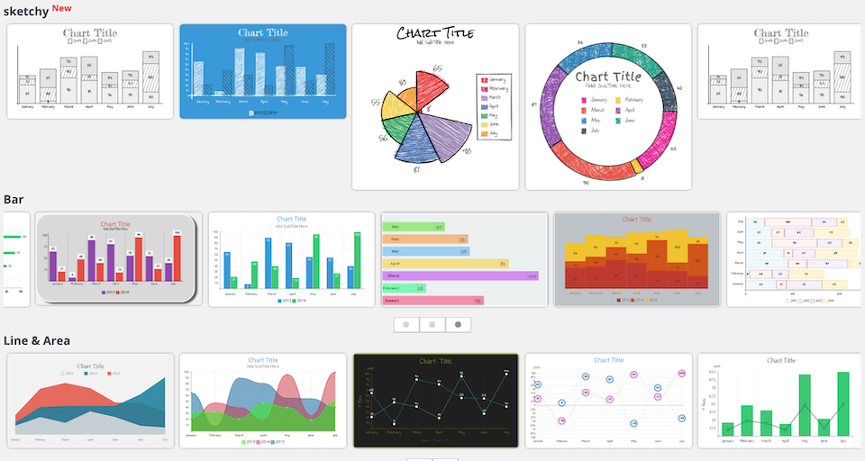 스프레드 시트 패널에 데이터를 추가하거나 MS Excel에서 업로드할 때 차트의 실시간 미리 보기를 제공하는 무료 차트 및 그래프 작성 서비스다. 선, 막대, 누적 막대, 레이더, 원형 및 도넛과 같은 일련의 차트 유형 중에서 선택할 수 있다. 이 서비스는 등록이나 다운로드가 필요하지 않다.