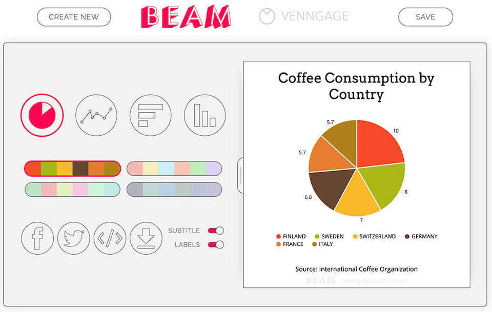 Beam을 사용하면 다양한 모양과 색상으로 아름답고 전문적인 차트를 만들 수 있다. 그래프를 소셜 미디어에서 공유하거나 웹 사이트 또는 블로그에 삽입할 수 있다. 데이터 시각화는 모바일에 최적화되어 있으며 제작이 자유롭다.