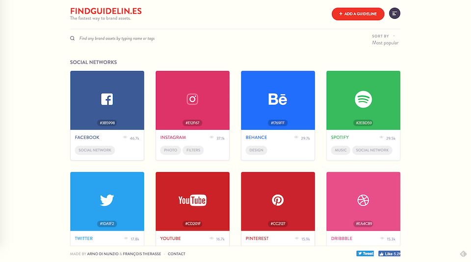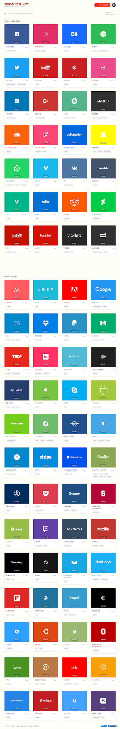 가장 활용도가 높은 브랜드 자산은 글로벌 유명 브랜드와 소셜 네트워크 서비스 회사의 브랜드다. 이 글을 통해 소개하는 '파인더 가이드라인(Find Guidelines)'는 주요 브랜드의 브랜드 자산을 손쉽게 찾고 활용할 수 있는 브랜드 자산 디렉터리 서비스다. 디자이너 기여 형태로 새로운 브랜드 자산이 추가되고 있어 앞으로 브랜드 자산 디렉터리에 축적될 브랜드는 날로 늘어날 것으로 보이며 서비스 이용은 무료다.