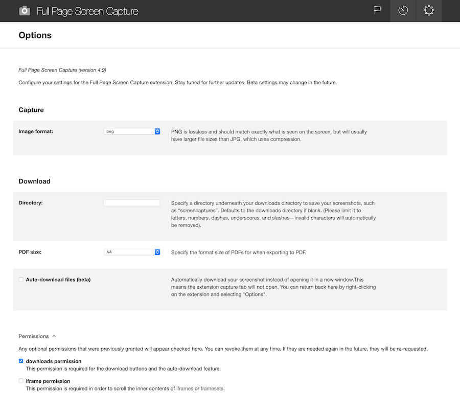 설정 메뉴에서 이미지 포맷 방식을 지정할 수 있는데 PNG, JPG 포맷을 지원한다. 저장할 디렉터리 지정도 가능하며 PDF 파일로 저장시 네 가지 포맷 사이즈(US Letter, US Legal A4, full image)를 지정할 수도 있다. 보고서용 A4 사이즈 PDF 파일로 저장하면 규격에 맞춰 분할 페이지로 깔끔하게 나누어진 한 개의 PDF 파일로 저장된다.