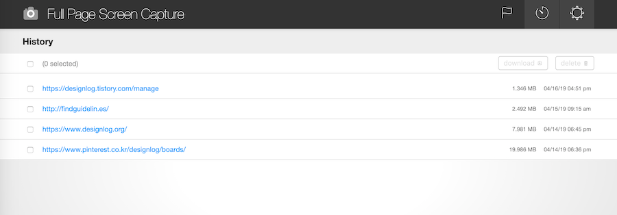 전체 페이지 화면 캡쳐(Full Page Screen Capture)는 구글 크롬 브라우저 확장 프로그램으로 설치해서 사용할 수 있다. 스크립 캡처 결과물을 PDF와 이미지로 다운로드할 수 있고 히스트로 메뉴를 통해 스크린 캡처 내역을 확인하고 언제든지 다시 다운로드할 수 있다. 기존 내역을 삭제도 가능하다.