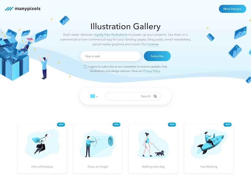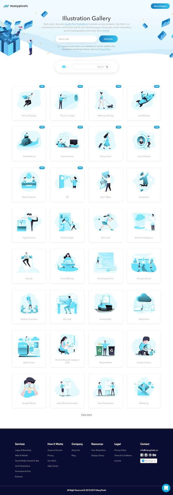 일러스트레이션 갤러리는 로열티가 없는 프로젝트 삽화 모음 사이트다. 매주 업데이트되는 현대적인 스타일의 세련된 고품질 일러스트는 개인과 업무용으로 사용하기 좋다.