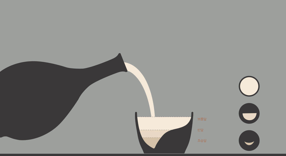 술잔을 비우거나 채우면 마치 달의 모양이 바뀌듯 변화를 보인다. 첫인상은 기발함과 디자인에 매료되기 전에 막걸리 한잔이 먼저 생각나게 한다.