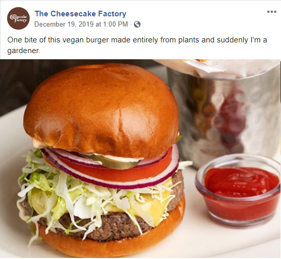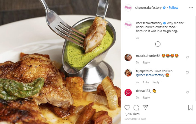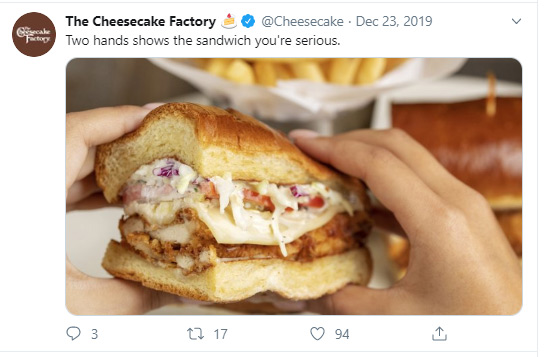 The Cheesecake Factory의 다음 3개 게시물(트윗, Facebook 게시물 및 Instagram 게시물)을 살펴보십시오. 각 캡션은 간단하고 비공식적인 언어와 재치 있는 어조로 작성됩니다. 이는 회사가 모든 플랫폼에서 음성 브랜드를 일관되게 유지할 수 있는 방법을 보여주는 완벽한 예입니다.