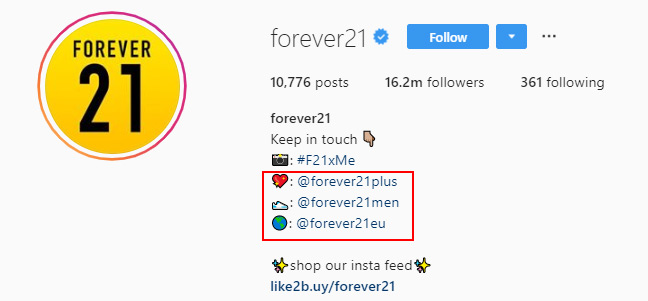 Forever 21은 전 세계적으로 폭넓은 관객을 확보하고 있는 세계적으로 유명한 패션 브랜드입니다. 소셜 미디어 마케팅 노력을 강화하기 위해 회사는 4개의 브랜드 Instagram 계정을 만들었습니다.