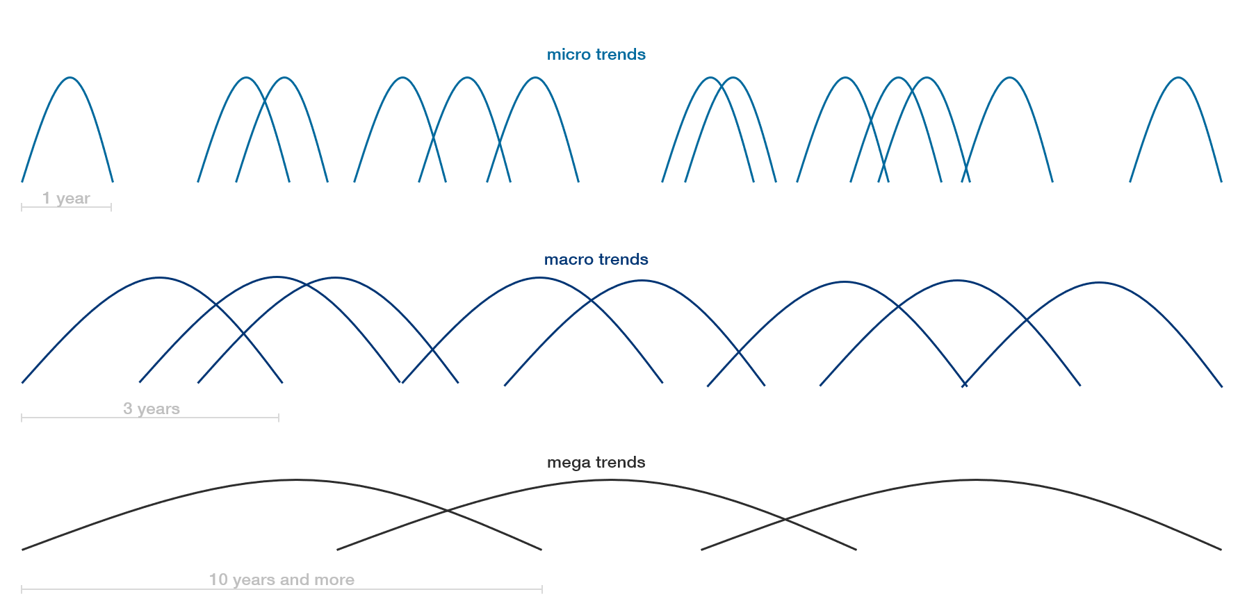 트렌드는 언급된 주기와 같이 더 큰 구조 아래 한 단계 아래에 있습니다. 적어도 부분적으로 반응하는 것 외에 트렌드는 현재 또는 미래를 예측하기 위해 과거 또는 현재의 다가오는 주제를 취하고 있습니다. 따라서 그들에게는 내재된 불확실성이 있습니다. 그들이 왜 그렇게 매력적인 지 한 가지 측면입니다. 트렌드 유형은 "메가 트렌드", "매크로" 및 "마이크로" 트렌드입니다(그림 2). 그 다음에는 더 작은 구조인 "유행"이 따릅니다.