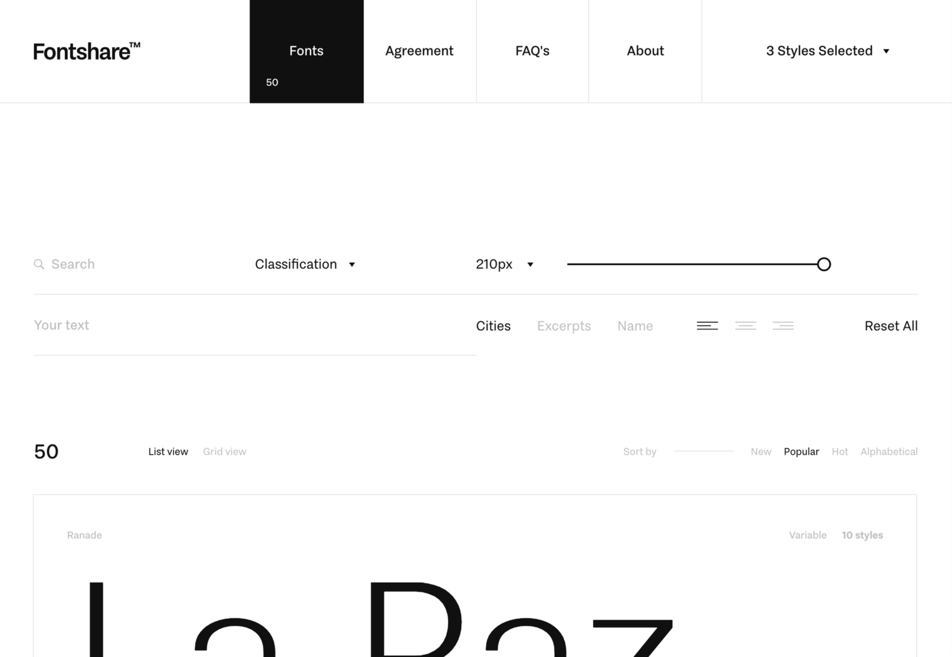 폰트쉐어(Fontshare)의 모든 폰트는 ITF가 소유하고 있으며, 다른 파운드리를 포함하도록 서비스를 확장할 계획은 없습니다. 그 결과, 구글 폰트(Google Fonts)보다 훨씬 적은 수의 폰트를 사용할 수 있습니다. 그러나 폰트의 품질은 Google 서비스가 제공하는 많은 폰트보다 우수하고 지속적으로 높여가고 있습니다. ITF는 장인정신에 자신감이 있어서 글자에 윤곽선이 표시되어 곡선을 검사할 수 있습니다.