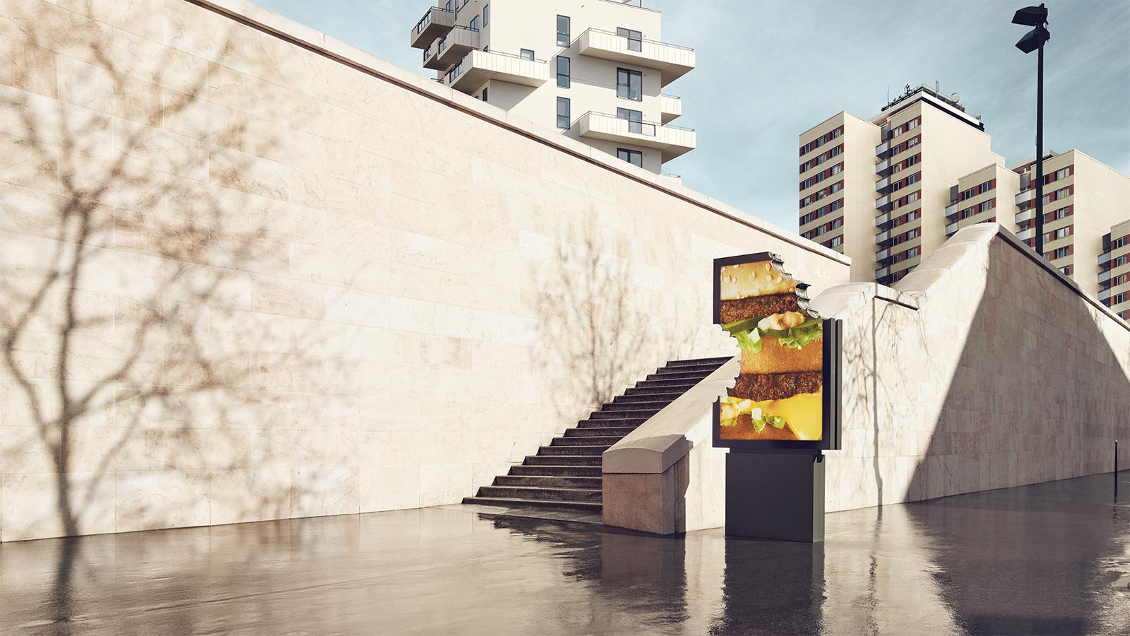 그런 다음 작년에 브랜드는 전체 빌보드에서 한 입 베어 먹은 듯한 부분을 제거한 클래식 메뉴의 클로즈업 샷이 포함된 포스터를 만들었다.