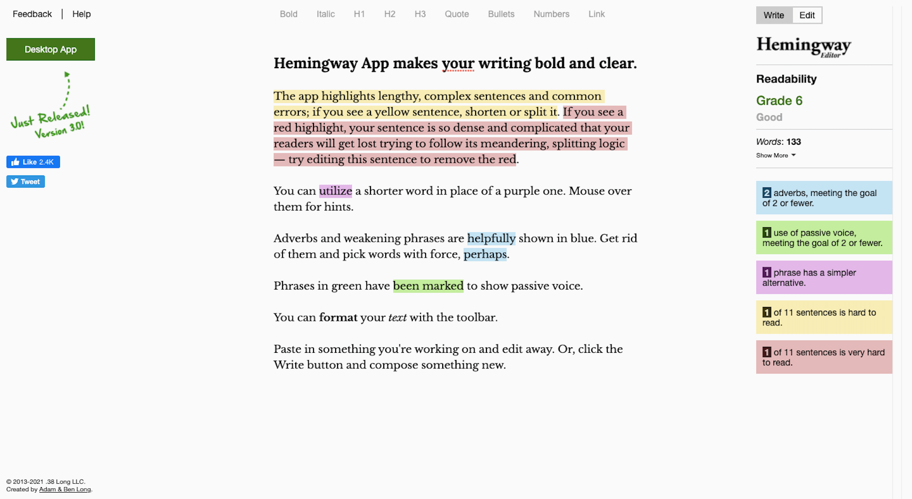 헤밍웨이(Hemingway)와 같은 도구를 사용하여 페이지의 가독성을 높일 수 있습니다. 각 페이지의 텍스트를 편집기에 빠르게 띄우고 권장 사항을 따르십시오.