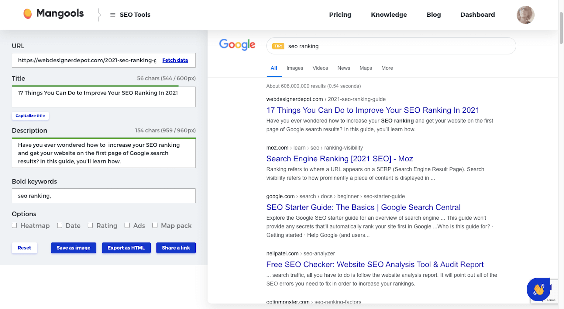 이를 위해 사용할 수 있는 도구가 많이 있지만 저는 Mangools의 SERP 시뮬레이터를 선호합니다.
