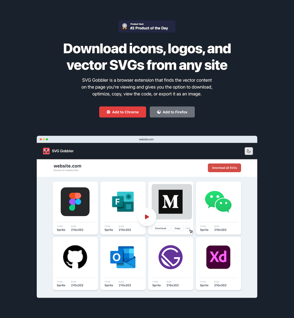 이 글을 통해 소개하는 SVG Gobbler는 사용자가 보고 있는 페이지에서 벡터 콘텐츠(SVG)를 찾고 코드 다운로드, 최적화, 복사, 보기 또는 이미지로 내보낼 수 있는 옵션을 제공하는 브라우저 확장 프로그램이다.