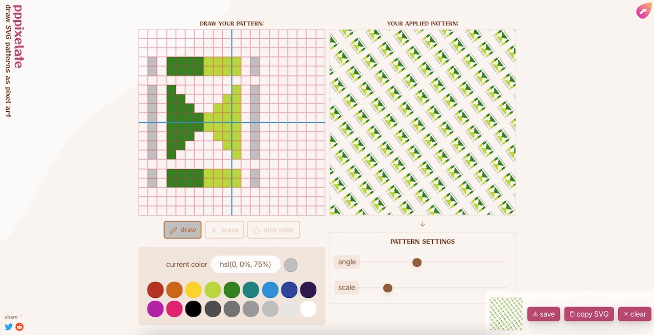 피피픽셀레이트(pppixelate)는 마치 윈도우즈의 그림판처럼 누구나 손쉽고 간단하게 픽셀 아트로 재밌는 SVG 패턴을 그리고 활용할 수 있는 SVG 패턴 생성 도구다