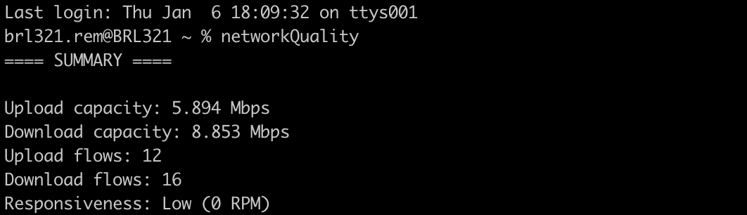 업로드 및 다운로드 용량은 기본적으로 Ookla의 Speedtest와 같은 테스트 사이트에서 볼 수 있는 것입니다. 기본적으로 networkQuality명령을 사용하면 기본 서버에 대한 연결을 테스트합니다.