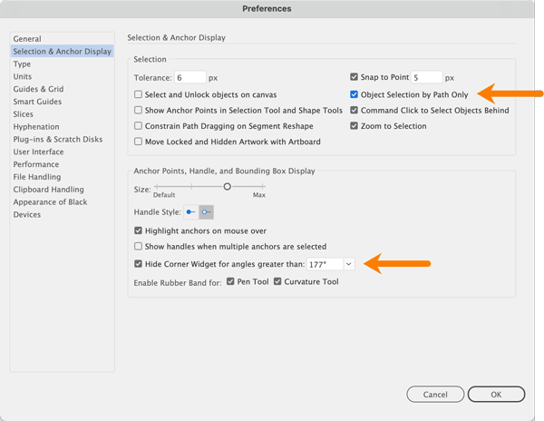Carlos Garro는 많은 옵션이 있는 선택 및 앵커 표시 섹션에서 기본 선택 동작을 변경합니다. 특히, 그는 Object Selection by Path Only 상자를 선택합니다. 이렇게 하면 잘못된 클릭으로 인해 개체가 실수로 선택되는 경우가 줄어들며 복잡한 아트웍으로 작업할 때 특히 유용합니다.
