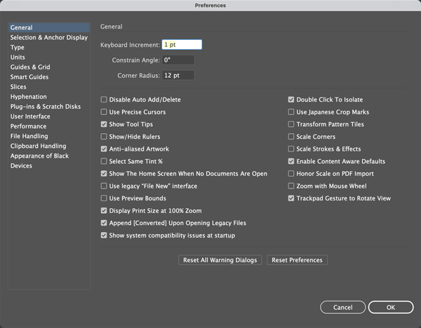 일반으로 시작하여 키보드 증분을 조정하여 화살표 키로 이동 선택을 제어할 수 있습니다. Shift 키를 누른 상태에서 화살표 키를 누르면 여기에 지정된 양의 10배만큼 이동합니다. 미세 제어를 위해 기본값을 작게 설정합니다. 1pt 또는 픽셀로 낮게 설정했습니다. 반대로 아트웍이 피트나 미터로 측정되는 경우, 이 증분을 크게 늘리고 싶을 것입니다. 그렇지 않으면 화살표 키를 사용할 때 항목이 움직이는 것을 거의 볼 수 없을 것입니다.