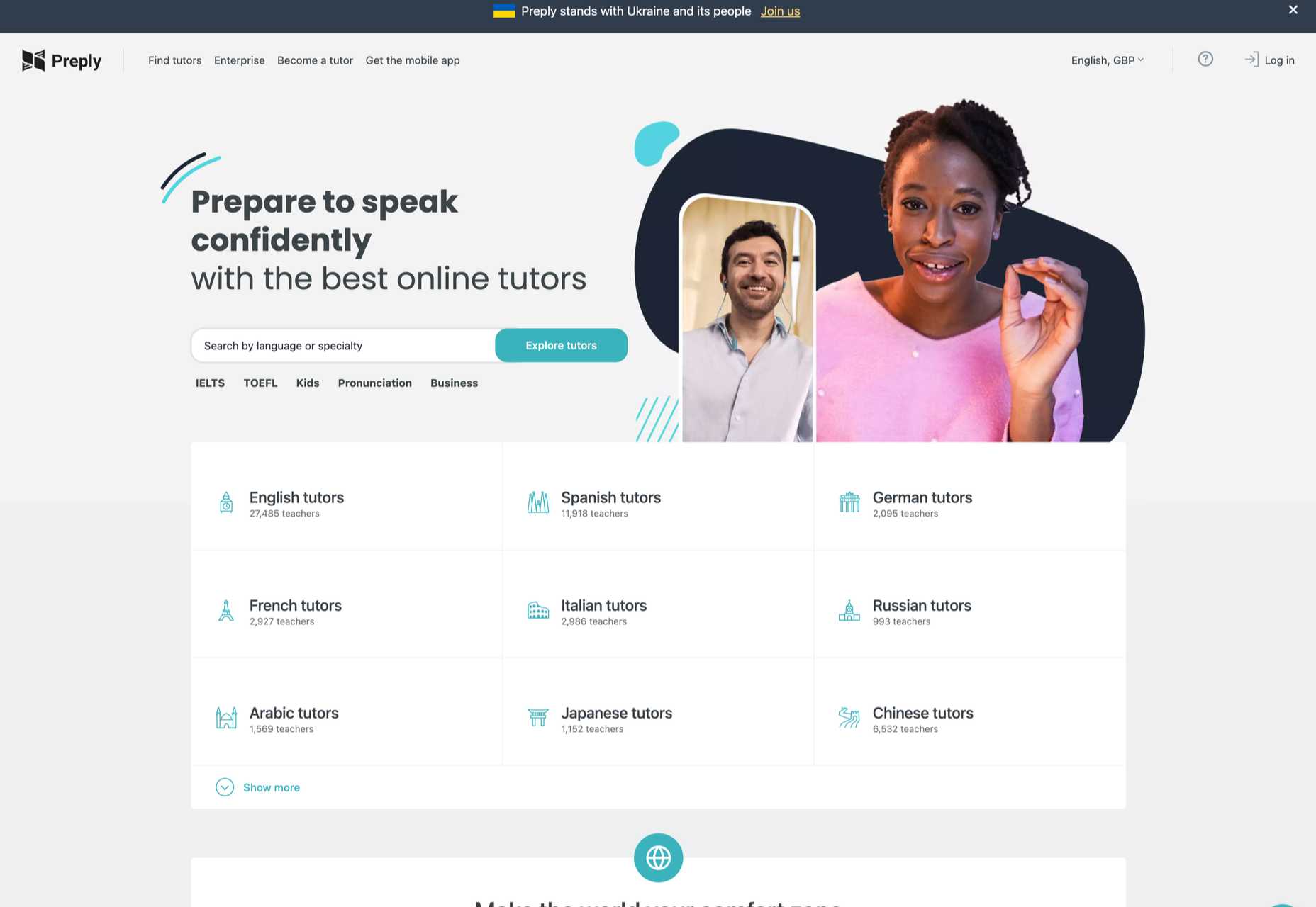 웹사이트를 다국어로 만드는 적절한 방법을 이해하려면 최고의 언어 학습 앱의 예를 살펴보세요. 예를 들어 Preply 에는 폴란드어, 우크라이나어, 독일어 등 여러 언어 옵션 중에서 선택할 수 있는 드롭다운 메뉴가 있습니다.