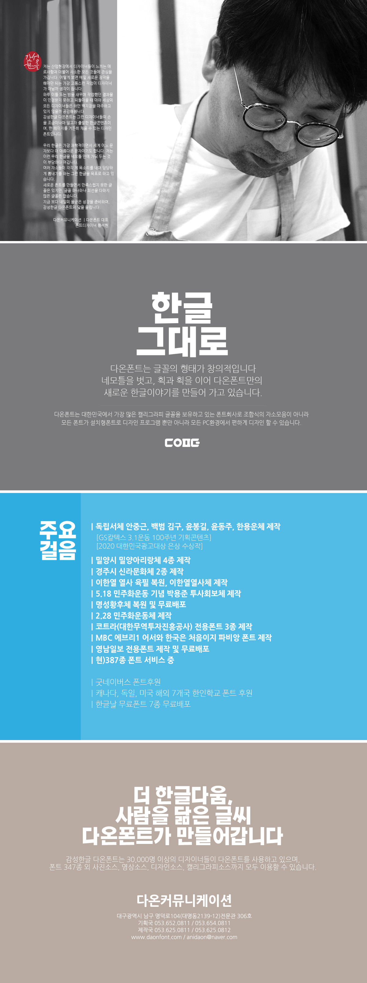 다온폰트는 한글의 아름다움을 담아내는 폰트 디자인 기업으로, 단순히 한글 폰트를 제공하는 것을 넘어, 한국어의 아름다움과 가치를 전파하는 데 중점을 두고 있습니다. 또한 한국어의 독창성과 아름다움을 세계에 널리 알리고자 하는 의지는 다온폰트의 모든 제품과 프로젝트에 깊이 스며들어 있습니다.