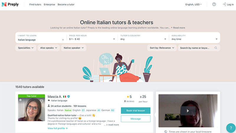 이제 Preply를 살펴보도록 하자. 온라인 이탈리아어 튜터용 랜딩 페이지는 양질의 랜딩 페이지가 어떤 모습이어야 하는지 보여주는 좋은 예다.