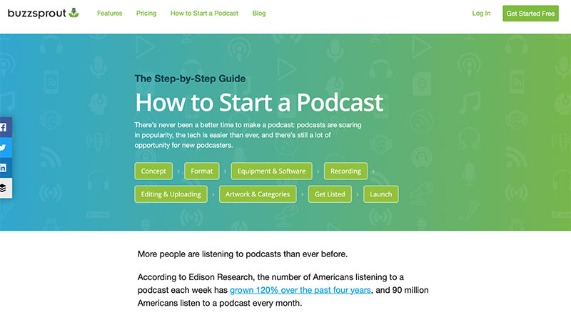 Buzzsprout의 “ 팟 캐스트 시작 방법 ”랜딩 페이지는 정보에 부담을 주지 않고 액세스 할 수 있는 방법을 보여주는 좋은 예다.