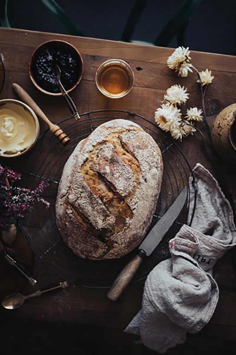 “수제 빵이 중앙에 있는 소박한 시골 정물의 평면도.” (사진 포트폴리오용)