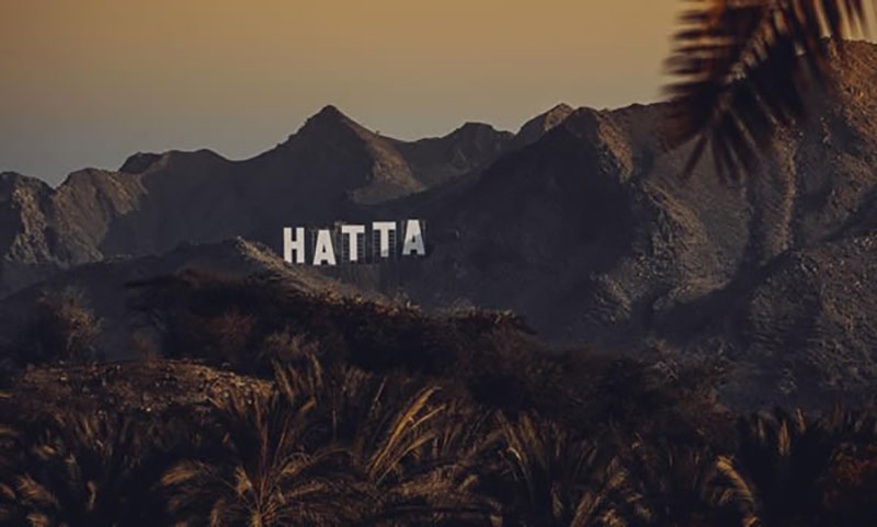 (alt="저 멀리 거대한 흰색 "Hatta" 표시가 있는 일몰 산의 전망.")