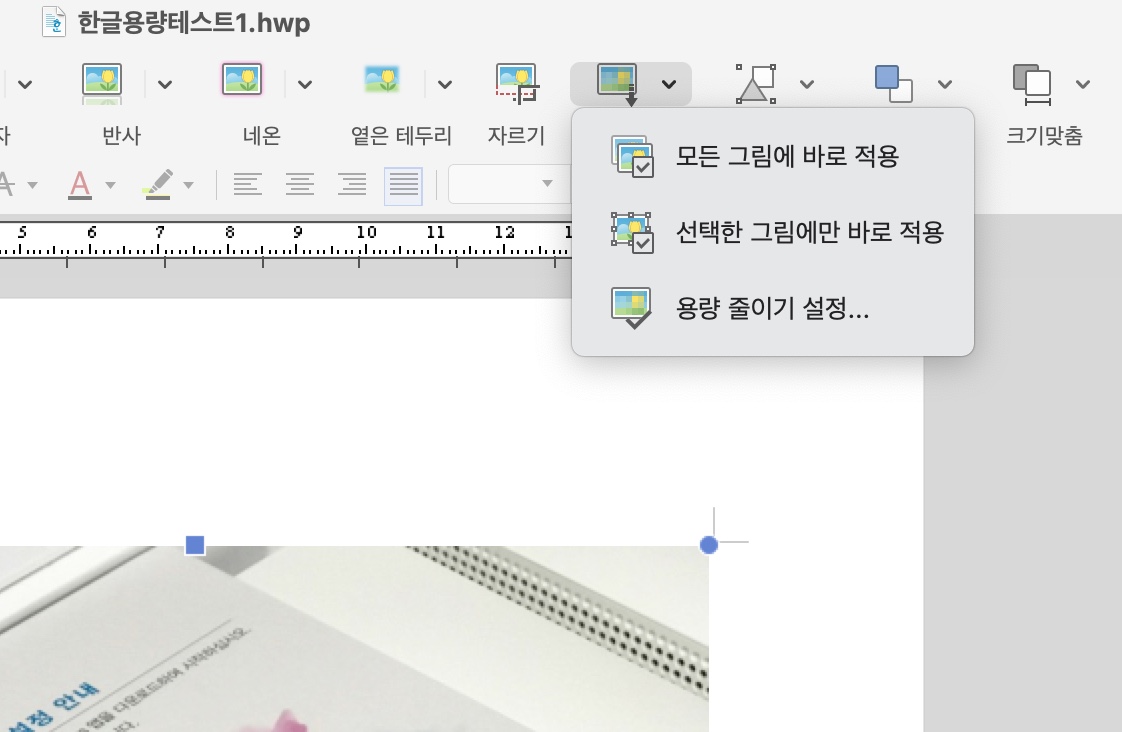 5. 실제 한글 저장용량 테스트 기반으로 가장 최적화된 그림 용량 줄이기 설정은 다음과 같다.