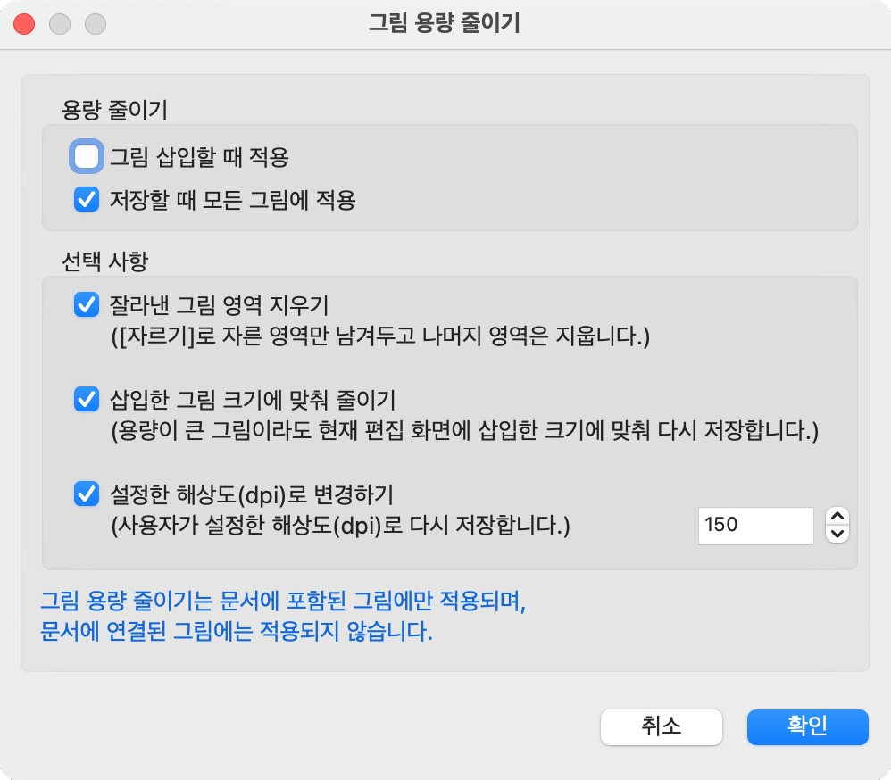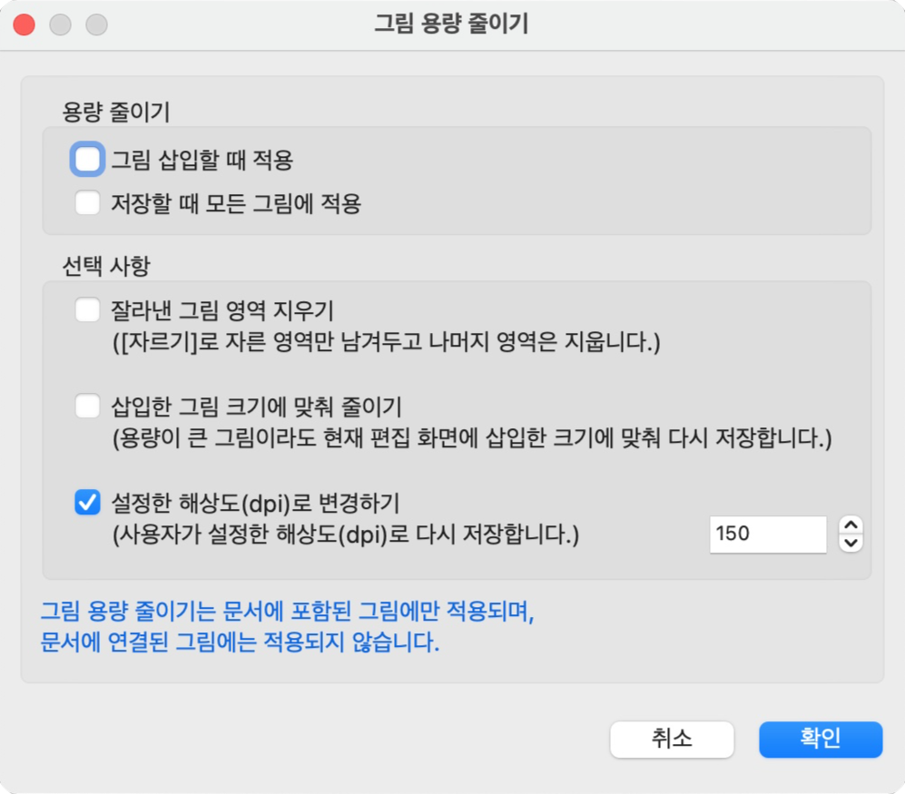삽입한 그림 크기에 맞춰 용량에 맞춰 줄이기를 체크하는 경우, 이미지 해상도가 저하되거나, 확대 시 뭉개지는 경우가 발생하기도 하니 고려할 필요가 있다.